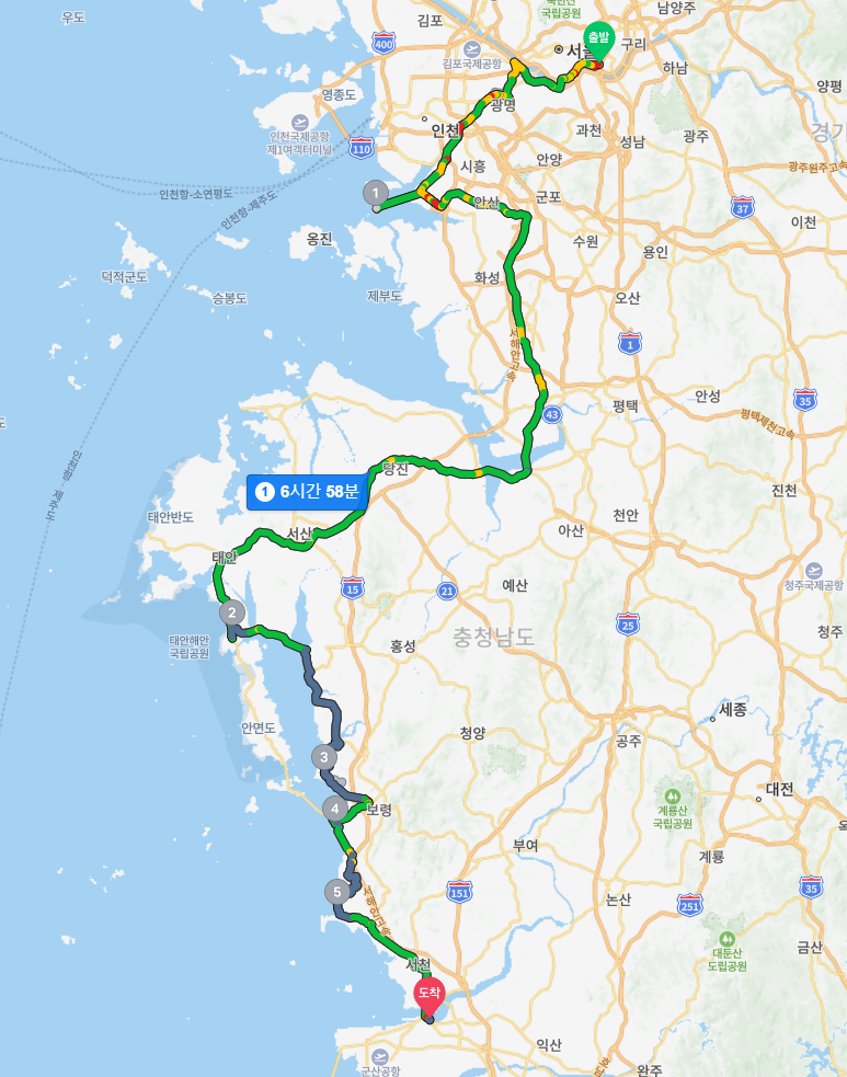 1일차: 서울 -> 시화방조제 -> 대부도 -> 태안반도 -> 군산 (약 350km)