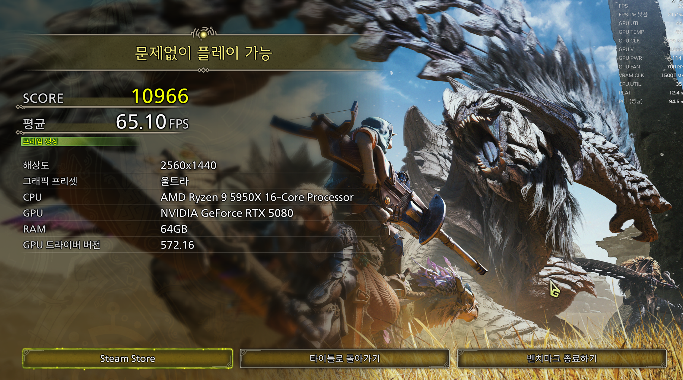 그러고나서 처음엔 사이버펑크 벤치마크로 CPU 테스트를 위해 DLSS, RT, FG 등의 옵션을 모두끄고 벤치를 돌렸는데 이전보다 프레임이 2배이상이 나오는거 보고 응?? 하면서 몬헌 벤치를 돌려봤습니다.